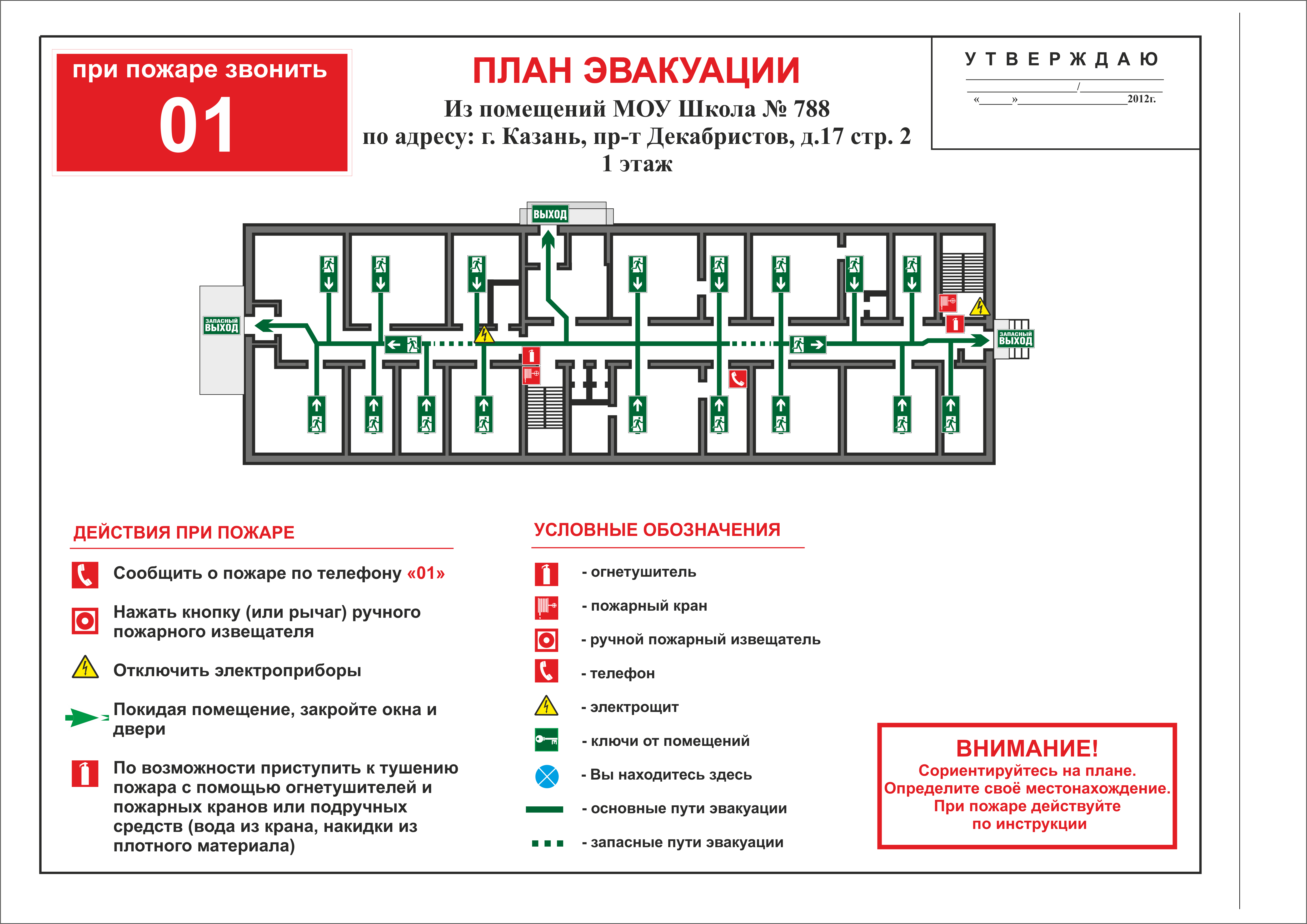 План пожарной эвакуации составляется для этажа здания или для его части – одного или нескольких помещений, которые занимает организация. Также составляются секционные схемы для отдельных участков этажа большой площади, разделенных турникетами или раздвижными дверями. К планам предъявляются требования, утвержденные ГОСТом. Их необходимо соблюдать, использовать общепринятые обозначения и форматы.